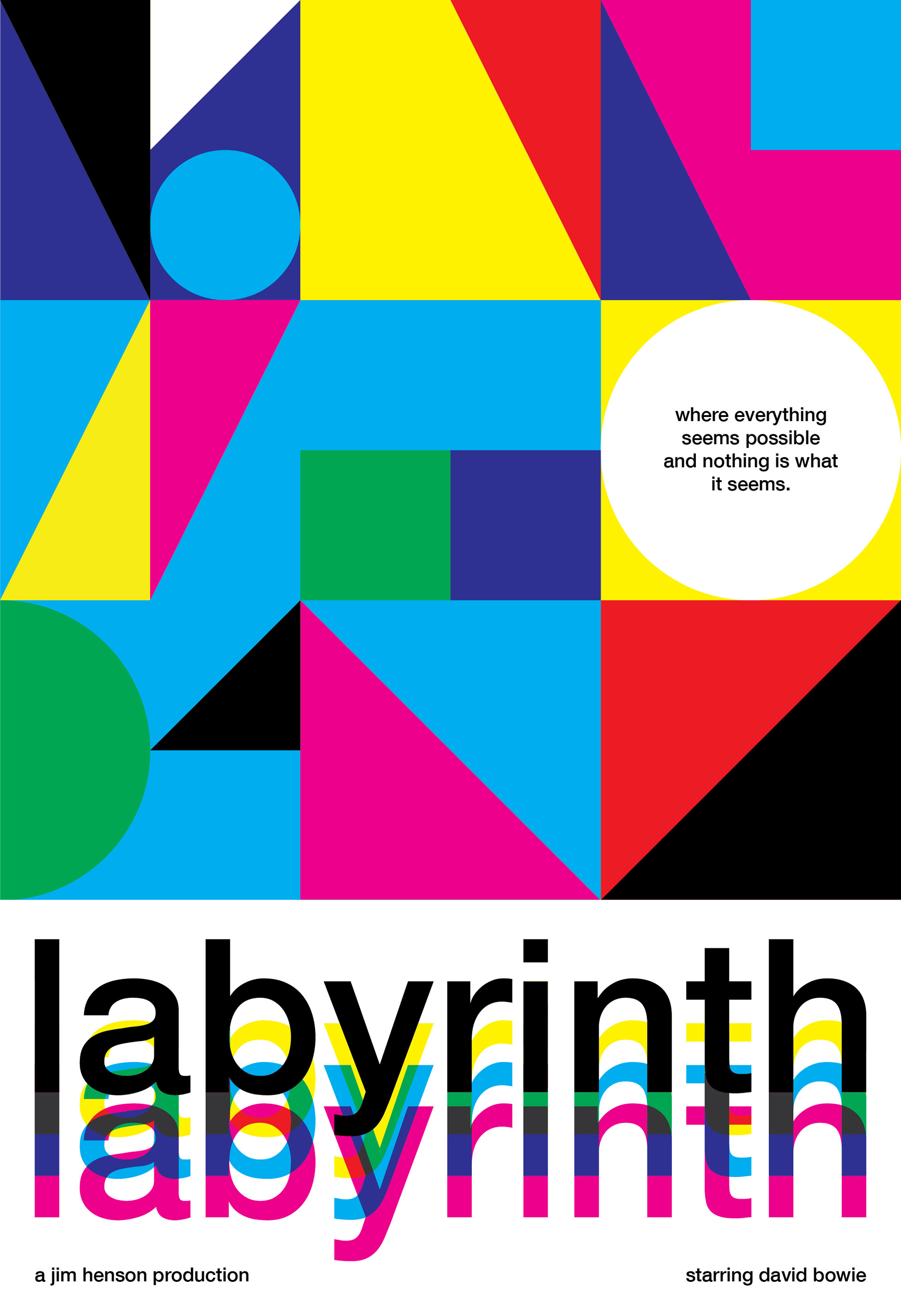 This Swiss design poster is inspired by the movie Labyrinth, specifically the iconic scene where the characters navigate a maze of twisting staircases—an homage to M.C. Escher’s famous lithograph, Relativity. The poster reinterprets this imagery using bold geometric shapes and primary colors, reflecting the clean, minimalist aesthetic of Swiss design. A classic grid structure provides clarity in the composition, giving the design a sense of order while capturing the surreal nature of Labyrinth.